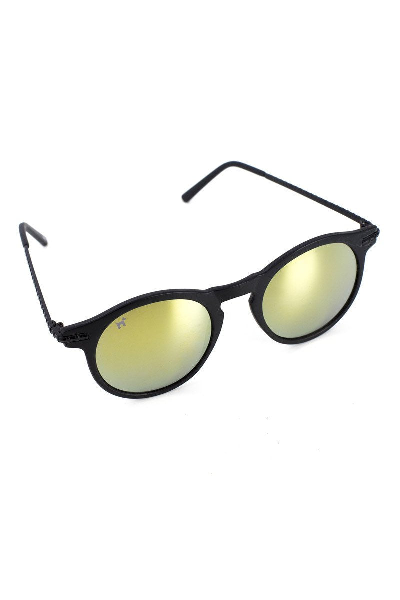 Lentes Redondos Color Negro Mate con Cristales de Espejo Amarillos. Pata metálica Color Negro. Detalle Logo Perro sobre Cristal Derecho en Parte Superior. Serigrafía "Williot" en parte Interior Pata Derecha....