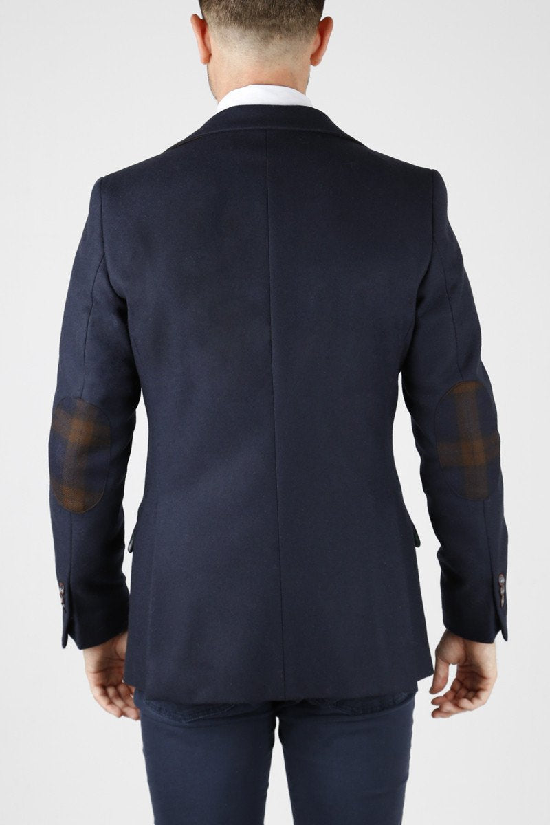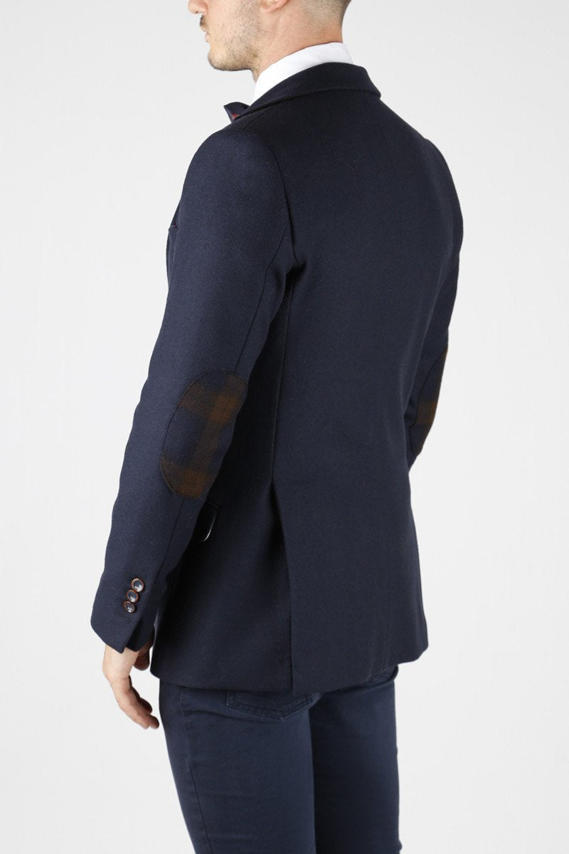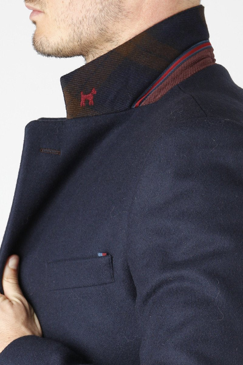 Blazer marino. Detalle coderas cuadros café y marino. Detalle puño con botones y cinta. Cuello interior cuadros marino-café y burdeos con cinta.