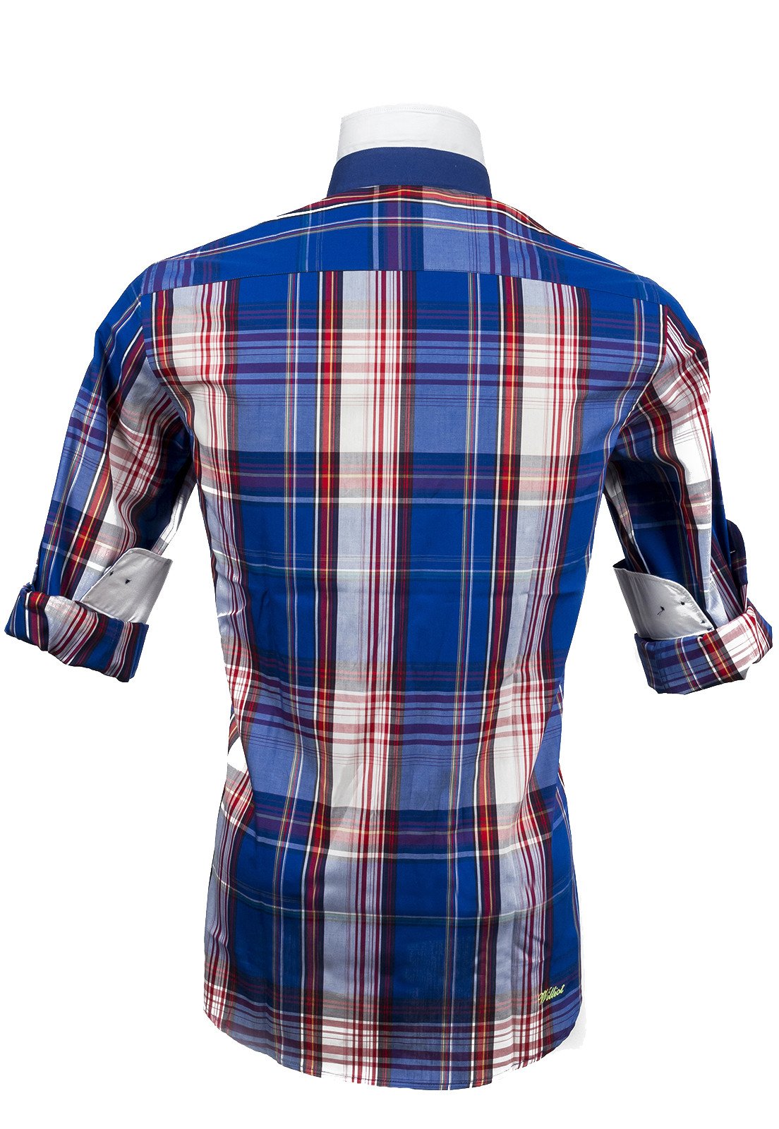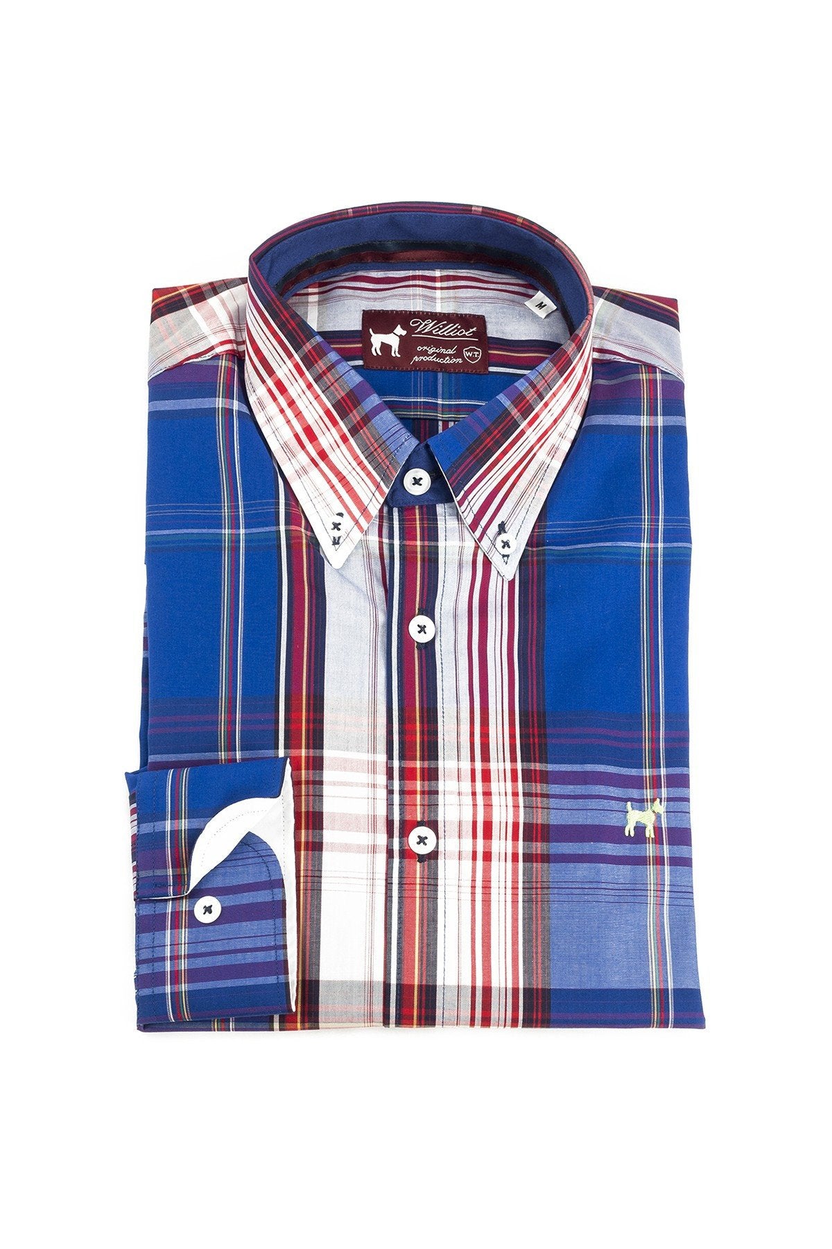 Camisa cuadros azul y rojo. Logo perro color blanco. Ojal color marino. Escudo en la parte inferior derecha y etiqueta Williot bordada en la parte inferior central. Serigrafía Williot en la parte trasera color blanco. Puño interior blanco. Solapa cuello interior parte inferior azulón, parte superior blanco. Fabricado en EU.